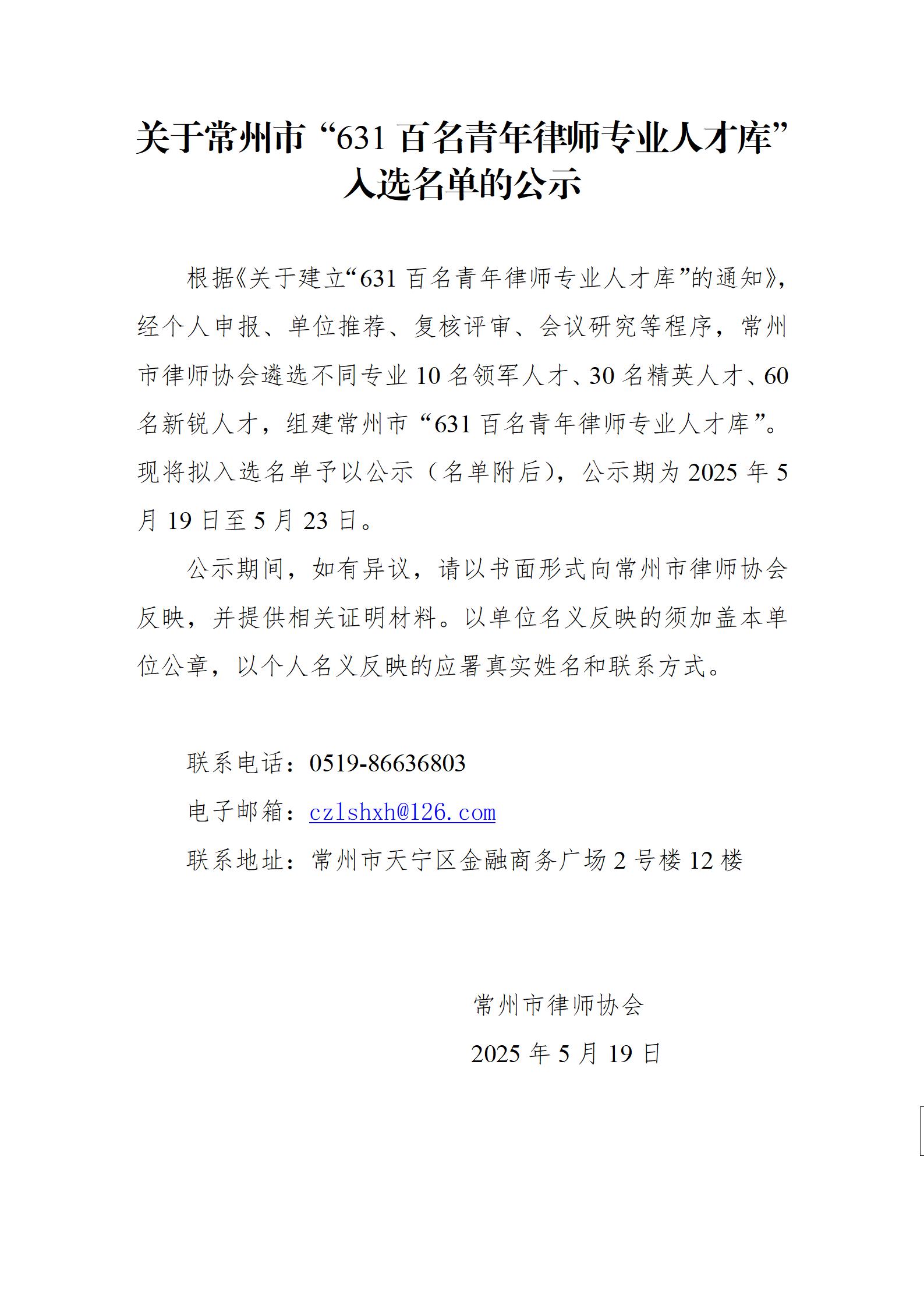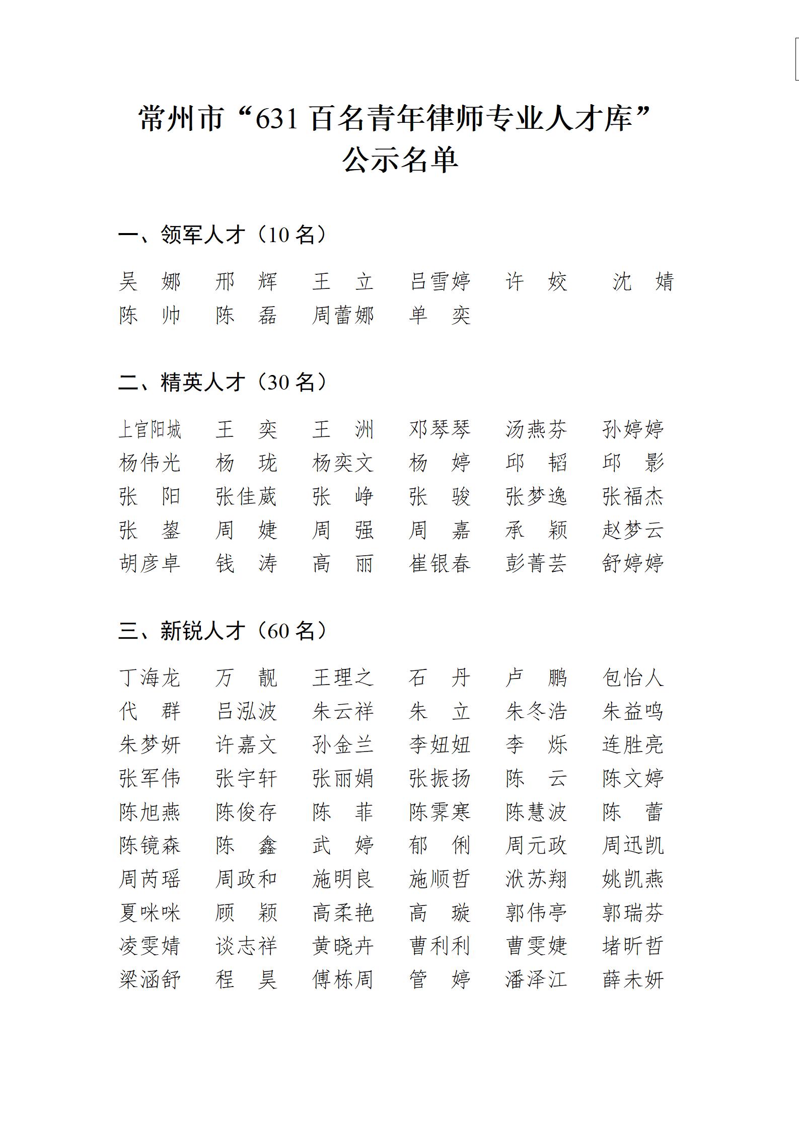 关于常州市“631百名青年律师专业人才库”入选名单的公示